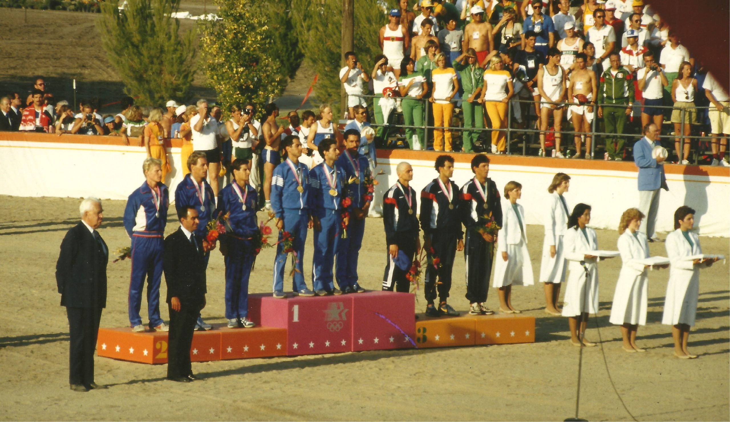 Joël Bouzou, actuel Président de la FFPM, avait déjà participé aux JO de Moscou en 1980 et avait été médaillé de bronze aux Mondiaux de Rome en 1982 en individuel, il est ensuite devenu Champion du monde en 1987 en France à Moulins. Didier Boube est arrivé en pleine forme à ses Jeux Olympiques. Paul Four était aussi talentueux que fantasque mais parfaitement prêt physiquement pour cet événement. Comme Joël Bouzou, il avait participé aux JO de Moscou où ils avaient pris la 5e place par équipe avec Alain Cortes. De plus, les Tricolores étaient montés sur le podium des Championnats du monde de Warendorf en 1983 l’année qui a précédé les Jeux Olympiques de 1984.
